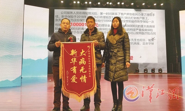 ????近日,新華保險襄陽中支一次性向客戶方女士(化名)支付理賠金110萬元,為其年僅一歲不幸罹患白血病的女兒送去希望。1月8日,該公司在棗陽舉辦理賠會。圖為客戶家屬向該公司總經理陳嵐(左)贈送錦旗,對公司誠信理賠表示感謝。