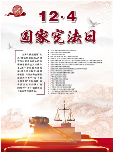 為深入推進我區“七五”普法規劃實施,大力宣傳以憲法為核心的中國特色社會主義法律體系,進一步弘揚憲法精神,普及憲法知識,按照中宣部、司法部和全國普法辦關于首個“12·4憲法宣傳周”工作部署,結合我區實際開展廣西2018年“12·4”國家憲法日集中宣傳月活動。