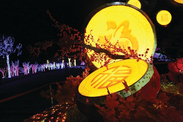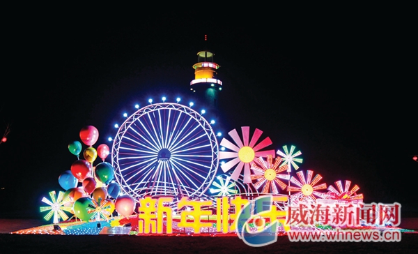 ????在五渚河公園南廣場入口處,一組以“福滿威海”為主題的燈光雕塑絢麗奪目。 通訊員 陳馨馨 攝