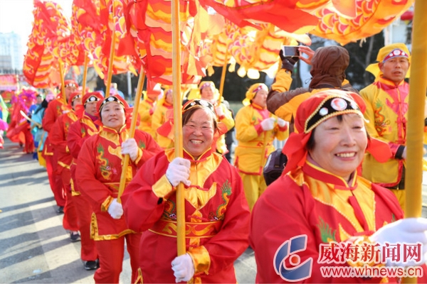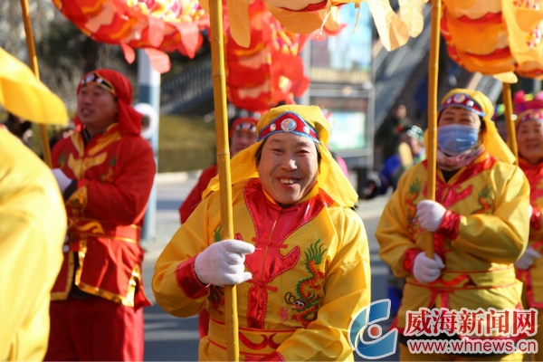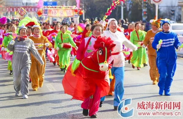 ????“太棒了,以前只能從電視上看到這么熱鬧的場(chǎng)面,今天在威海看到現(xiàn)場(chǎng)版的游藝活動(dòng),這才是真正的過年。”從廈門來威海度假的陳女士第一次看到這么熱鬧的場(chǎng)面,激動(dòng)得顧不上穿鞋,拿著手機(jī),套著酒店提供的拖鞋就跑了出來,一邊拍,一邊隨著現(xiàn)場(chǎng)的鼓點(diǎn)時(shí)不時(shí)扭兩下。
