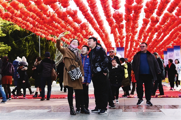 在赤山景區,紅紅火火的燈籠引得市民競相拍照留念。