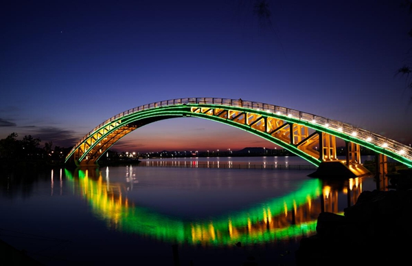 ????到了夜晚,華燈初上,彩虹橋閃動著五顏六色的光,映在靜謐的湖面上美麗而夢幻。湖畔溫潤的風輕輕吹著,湖水被倒映著的亭臺樓宇間的燈光點亮,如詩如畫。踏著彩虹橋的燈光拾級而上走到橋中心,可以北眺廣闊的藍湖,南望熱鬧的明珠河兩岸,頭上更是繁星點點,惹人迷醉。人們或結伴成對,或三五為組,悠然自得地行走在靜謐的公園內,靜享夜色南海。
