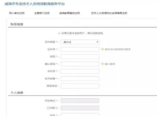 專業技術人員注冊與登錄:打開“威海市專業技術人員繼續教育服務平臺”,點擊“注冊”,選擇“專業技術人員注冊”,填寫證件號碼、姓名、密碼、所在單位、手機號碼、電子郵箱等信息,點擊“注冊”并由所在單位審核通過后,即可通過“用戶登錄”界面進入平臺進行學習,所獲學時自動計入本人學習檔案。專業技術人員信息也可由用人單位管理員下載模板填寫信息后進行批量導入,專業技術人員只需以身份證號碼和密碼(默認身份證號碼后6位)即可登錄學習。專業技術人員也可通過點擊“注冊進度查詢”進行審核結果跟蹤查詢。
