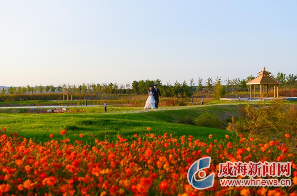 一對新人在金花河濕地公園拍攝婚紗照。威海晚報實習生 賽慧琳 攝