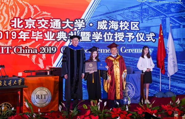 威海新聞網6月24日訊(通訊員 王曉根 王樹蔚)6月23日,位于南海新區的北京交通大學威海校區舉行2019年畢業典禮暨學位授予儀式,首批畢業生迎來大學四年最具儀式感的時刻,北京交通大學校長王稼瓊和美國羅切斯特理工學院校長大衛·芒森共同為畢業生頒授學位。