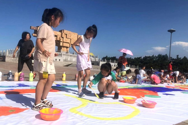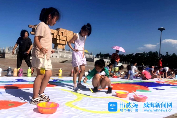 8月30日,2019威海國際藝術博覽會(以下簡稱威海藝博會)開幕式背景畫創作活動在威海公園舉行。威海藝博會開幕式藝術總監、著名油畫家靳春生攜手我市20余名兒童,以“夢想海洋”為主題,創作了長20米,寬3.4米的畫作。