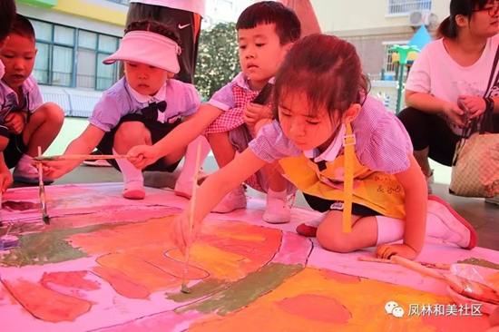????9月11日上午,繪畫活動在鳳林中心幼兒園操場進行,整面操場都鋪滿了準(zhǔn)備好的刷子和顏料,退役軍人和社區(qū)黨員志愿者和外來務(wù)工小朋友們、家長們,共同繪制這十米畫卷。