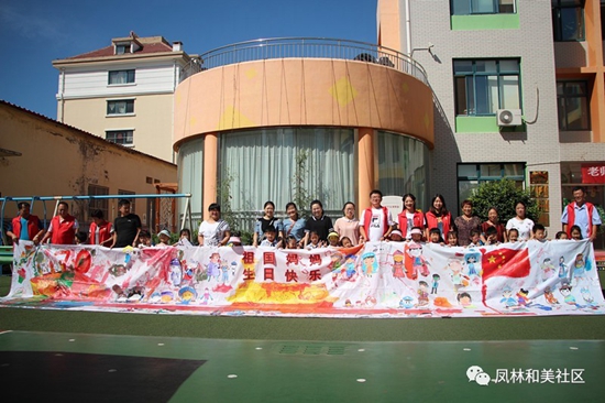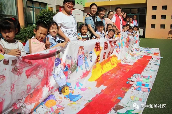????國慶七十周年,在長長的十米畫卷上,小朋友精心為祖國媽媽繪制了精美的蛋糕,表達(dá)了對祖國媽媽的美好祝愿……鮮艷的五星紅旗迎風(fēng)飄揚,雄偉壯麗的天安門廣場在畫卷中央分外奪目,孩子們用稚嫩的筆觸,展現(xiàn)著心中祖國的壯麗和家鄉(xiāng)的甜美。幼兒園上空飄蕩著孩子們嘹亮清脆的歌聲“五星紅旗迎風(fēng)飄揚……”社區(qū)家長說:“歌與畫交織,情與愛共鳴的美好畫面展現(xiàn)在現(xiàn)場每一人的心中,祝福我們偉大的祖國更加繁榮昌盛”。