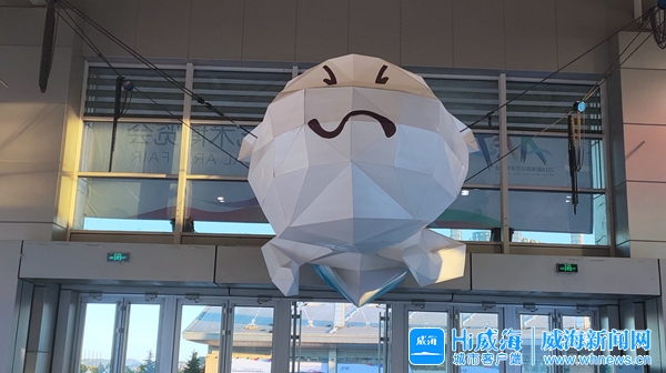 ????“艾米拉”位于威海國際展覽中心C館入口頭頂處,色彩以白色和藍色為主色調,其腿腳部分顏色深,身上淺,寓意嬰兒從藍色的海洋爬出來,化身為藝術的天使,降臨威海這片人杰地靈的土地上。