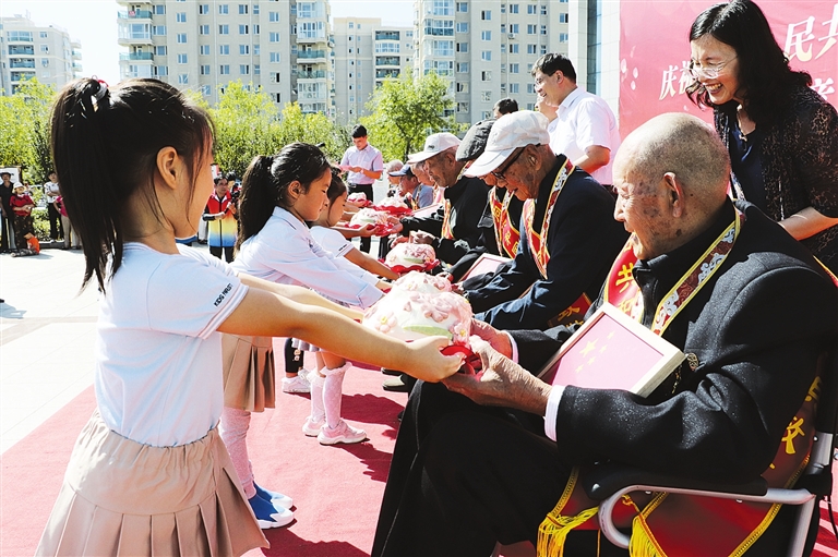小朋友為老戰(zhàn)士敬獻壽桃。