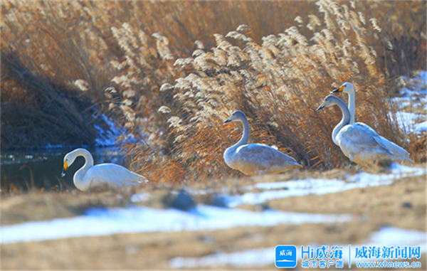 將鏡頭拉近,大天鵝飛翔的身影映在寧靜的水面,曼妙的身姿隨波搖曳,清脆的叫聲回蕩在蘆葦蕩深處。和雪一樣潔白的大天鵝,三五成群,或追逐戲水,或引吭高歌,怡然自得。眼前畫面宛如臨仙境,讓人不忍心打擾。
