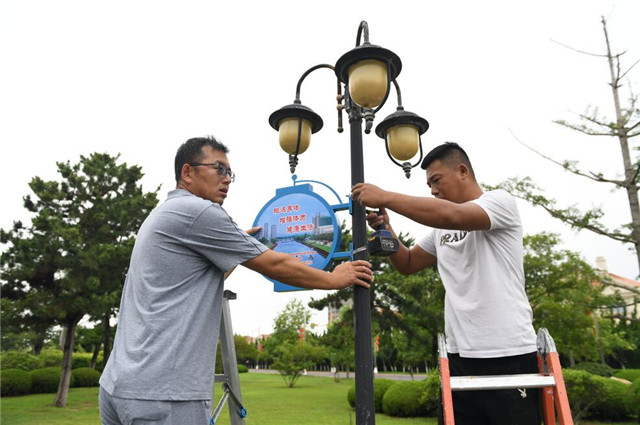 步道內,工人們正有序進行公益廣告燈牌安裝工作。“我們找專人設計了4種不同形狀、多種風格的燈牌在海景路沿線進行安裝,至少每隔200米就會有一個宣傳標語。”南海新區農業海洋局工作人員孫妍妮表示,不僅如此,在每個公園廣場顯著位置都設立了公益展板,還設置了兩處“中國夢”以及“富強、民主、文明、和諧”的景觀小品雕塑。公園綠地等地流動人口最多,做好宣傳工作不僅能讓大家感受到濃郁的創城氣氛,更能讓大家有“創城有我一份”的使命感,自發地愛護公園以及城市環境。