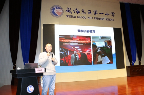 首先由哈爾濱工業大學(威海)控制科學與工程系主任邵春濤博士做了主題為“創客時代如何培養小學生綜合素養”的講座。邵博士從三個方面進行了深入淺出地論述:“創客教育”新在何處?創客教育如何提升中小學生的創新能力?創客教育與中高考改革趨勢。邵博士以行走機器人、人工智能、編程、3D打印等近十年來的熱門先進技術為例,向大家展示了現代科技驚人的飛速發展。他指出,“創客”是提升學生的動手能力、問題解決能力等素養的重要途徑;通過新技術的融入培養學生的創新思維,提升他們的創新能力是創客教育的重要意義所在。同時基于時代發展的需要,關注學生創新創造能力,也成為中高考改革及高校自主招生的趨勢。