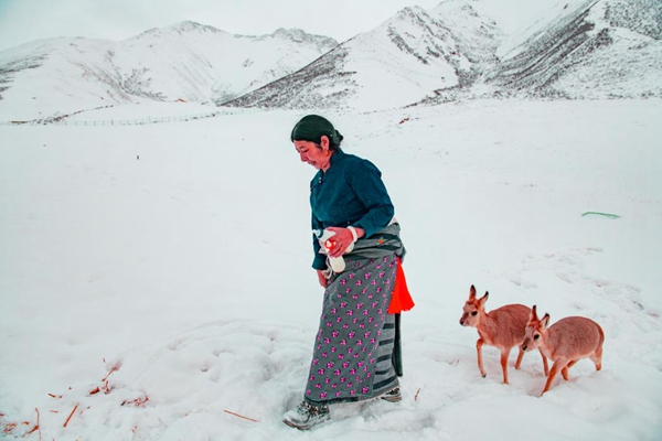 ????故事的主人公肉保、德措吉夫婦從2010年開始,帶著女兒從縣城搬到雪域高原人跡罕至的簡易板房居住,一家人都參與到對野生動物的救助中。這里交通極為不便,沒有綠葉蔬菜,冬天甚至只能取雪化水度日。肉保一家將救助的野生動物當做自己孩子一般照顧。當這些野生動物恢復健康、具備野外生存能力時,便將它們放歸自然。如今,經肉保家先后救助的野生動物,有鵝喉羚、馬鹿、白唇鹿、巖羊、藏原羚等18只。