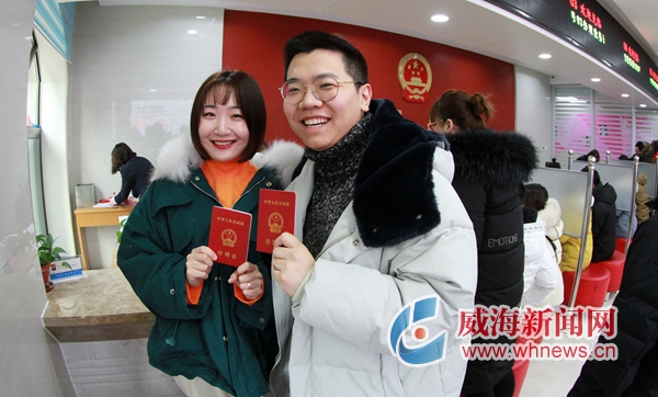 威海新聞網2月15日訊(記者 李林 通訊員 王祖昌)昨日是“2·14”情人節。當日一大早,環翠區婚姻登記處大廳就擠滿了前來登記結婚的情侶。領到結婚證的新人滿臉喜悅,整個登記大廳充盈著浪漫喜慶的氣息。