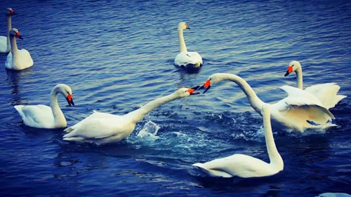 大天鵝的羽色潔白,體態(tài)優(yōu)美,叫聲動人,是冬日榮成一道靚麗的風(fēng)景。大天鵝一生嚴(yán)守一夫一妻制,若一方死亡,另一方則不食不眠,一意殉情,被人們比喻成忠貞愛情的象征。每年十月下旬,大天鵝如約而至,這些美麗優(yōu)雅的身影成群地聚集在它們選定的理想棲息地,波光粼粼的湖面上,倒映出它們優(yōu)美的姿態(tài),許多游客慕名前來觀賞,榮成的冬季也因此變得熱鬧。