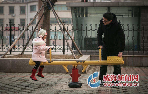 昨日,市區氣溫回升,家長帶著孩子在小區玩蹺蹺板。記者 薛航 攝