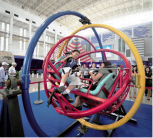 航天員們是乘著火箭打著旋沖上九天的,強大的平衡能力是他們戰勝眩暈的法寶。有志成為航天員的小朋友們不妨來展覽現場挑戰一下能夠模擬航天員前庭功能訓練的三維滾環,考驗自己能否在天旋地轉時保持平衡。