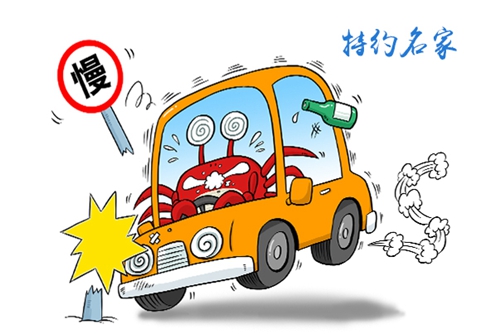 一只紅色的大醉蟹滿眼眩暈地坐在駕駛室,車輛東倒西歪地撞到了路邊的警示牌,飛出窗外的酒瓶道出了真相——“沾酒就變大醉蟹,橫行霸道把命貼”。特約漫畫家李強的作品《行路者戒》讓不少讀者看完之后開懷大笑。