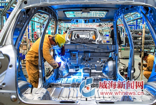 德瑞博新能源汽車工人焊接汽車構件。