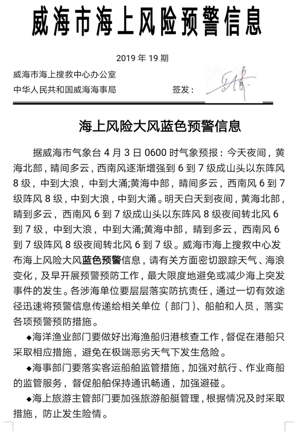 威海市氣象臺發布海上風險大風藍色預警信息
