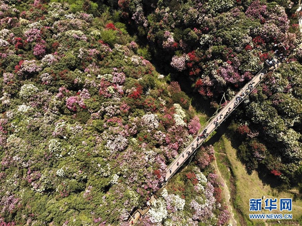 ????4月7日,游客在貴州省畢節(jié)市百里杜鵑金坡景區(qū)游覽(無人機拍攝)。新華社發(fā)(韓賢普 攝)