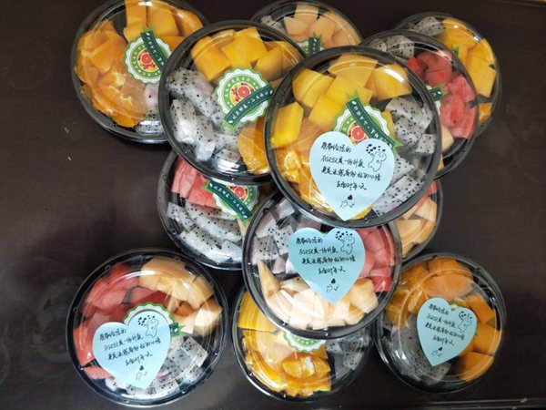 根據(jù)訂單要求,他精心備好兩種“果切三拼”水果禮盒,包括哈密瓜、火龍果、西瓜、芒果、甜橙5種水果,一共12盒。裝好果盒,他在每個(gè)禮盒上貼了一份手寫紙條,上面寫著“愿帶給您的不僅僅是一份外賣,更是讓您有份好的心情去面對(duì)每一天”,借此表達(dá)對(duì)消防員們的敬意。隨后,這12個(gè)水果禮盒被外賣小哥送到華夏路消防中隊(duì)。