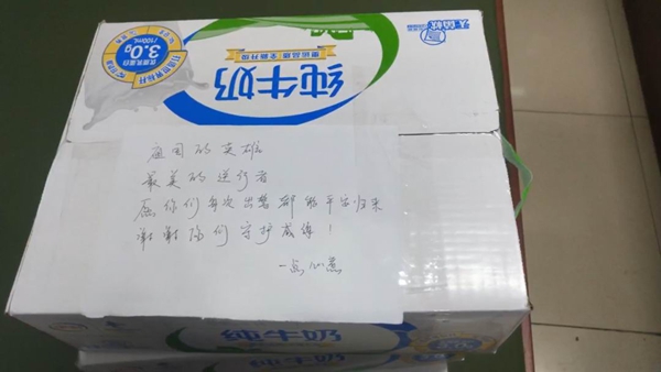 當(dāng)日下午一點(diǎn)多,威海市消防支隊(duì)直屬特勤中隊(duì)同樣也收到一份愛(ài)心禮物,它是愛(ài)心市民通過(guò)外賣平臺(tái)送來(lái)的甜品和牛奶等,在牛奶外包裝上還附有一張署名為“一點(diǎn)心意”的紙條:“祖國(guó)的英雄,最美的逆行者,愿你們每次出警都能平安歸來(lái),謝謝你們守護(hù)威海!”