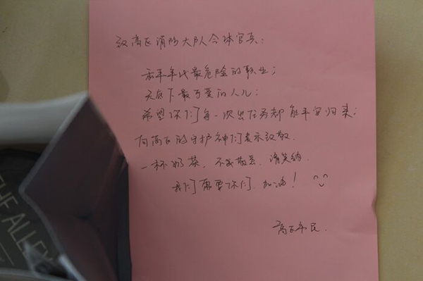 4日11時(shí)許,高區(qū)消防大隊(duì)消防員們也收到兩名熱心市民送來(lái)的愛(ài)心禮物——幾十份剛封裝好的熱奶茶及一封署名為“高區(qū)市民”感謝信。