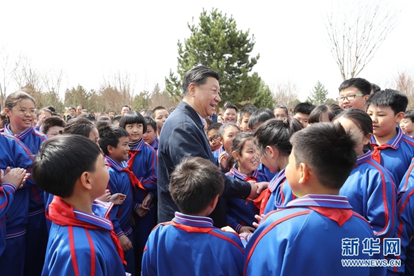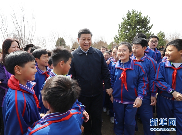 ????4月8日,黨和國家領導人習近平、栗戰書、汪洋、王滬寧、趙樂際、韓正、王岐山等來到北京市通州區永順鎮參加首都義務植樹活動。這是習近平同少先隊員在一起。 新華社記者 鞠鵬 攝