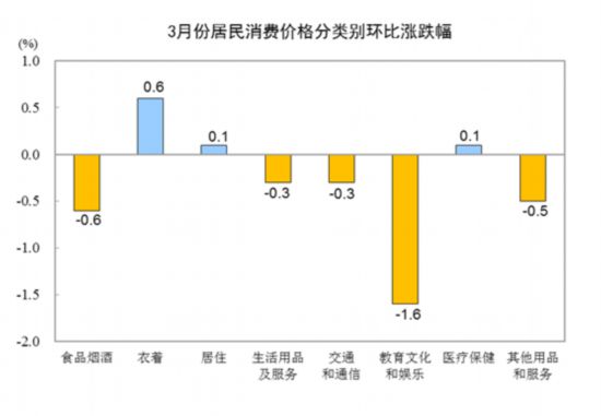 ????3月份,全國居民消費價格環比下降0.4%。其中,城市下降0.4%,農村下降0.3%;食品價格下降0.9%,非食品價格下降0.2%;消費品價格下降0.1%,服務價格下降0.8%。