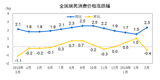 國家統計局今日發布數據顯示,2019年3月份,全國居民消費價格(CPI)同比上漲2.3%。其中,城市上漲2.3%,農村上漲2.3%;食品價格上漲4.1%,非食品價格上漲1.8%;消費品價格上漲2.4%,服務價格上漲2.0%。