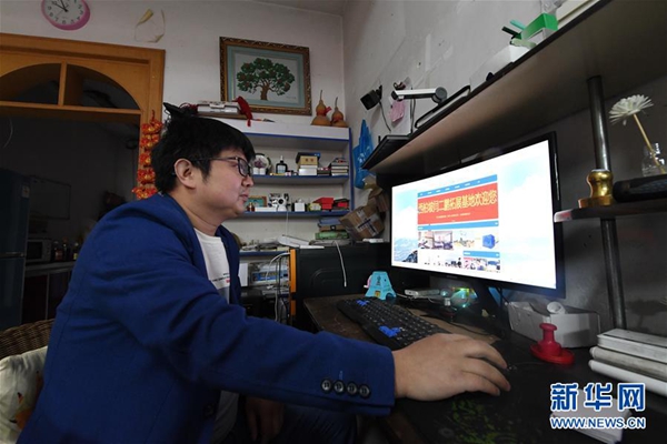 ????4月9日,閆二鵬在瀏覽網頁。看準了西柏坡村的旅游業前景,“80后”大學生閆二鵬2005年回到家鄉,接過了家里的旅館生意。新華社記者朱旭東攝