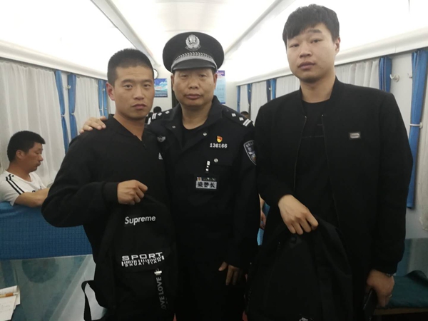 互換背包后,乘警與于先生(左)和侯先生一起合影 市公安局鐵路分局供片