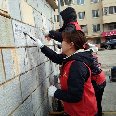 ????新都花園社區屬老舊小區,小廣告數量較多且粘得特別牢,給清理工作帶來一定難度。面對形形色色的小廣告,志愿者們用鏟子一一清理。經1個多小時的努力,共將6棟樓的小廣告清理干凈。