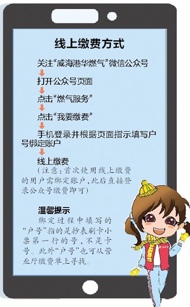 ????首次在公眾號上繳費的用戶需要綁定燃氣賬戶,即打開“威海港華燃氣”公眾號頁面后,點擊“燃氣服務”、“我要繳費”,之后手機快速登錄并根據(jù)頁面指示填寫戶號。需要注意的是,這里的“戶號”指的是抄表刷卡小票第一行的號,不是卡號。“戶號”也可從營業(yè)廳繳費單上尋找。燃氣賬戶注冊成功后,便可線上充值燃氣費,非常方便。