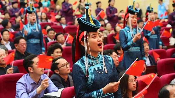 當(dāng)晚,隨著內(nèi)蒙古師范大學(xué)音樂學(xué)院學(xué)生合唱團(tuán)的一曲《哭泣的草原》,開幕式合唱演出拉開帷幕。只見合唱團(tuán)成員著裝整齊、精神飽滿、意氣風(fēng)發(fā),用悠揚(yáng)略帶蒼涼的旋律,表達(dá)著對消失的草原等生態(tài)破壞現(xiàn)象的焦慮心情,呼喚人們注重環(huán)境保護(hù)。
