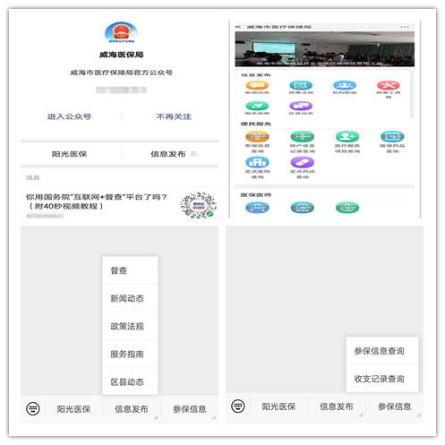 微信公眾服務平臺信息與官網同步更新,提供陽光醫保、信息發布、參保信息三個版塊20余項服務。參保人員關注公眾號綁定個人信息后,可在線查詢參保信息、賬戶收支記錄、醫療服務項目、醫保藥品、定點醫院、定點藥店等信息,方便群眾及時了解醫保工作進展。