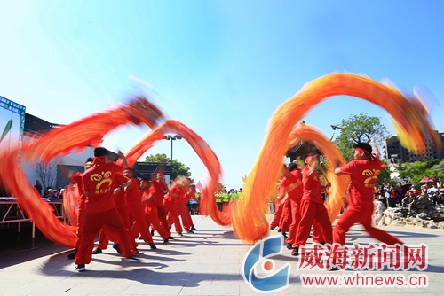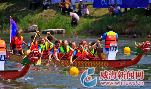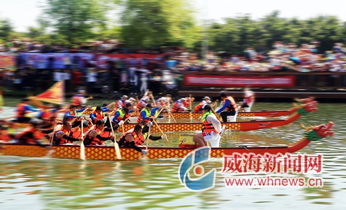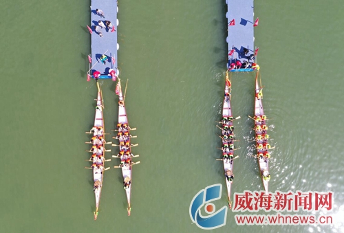 明珠河畔,浪花飛濺,鼓聲雷動,熱鬧非凡。6月7日,山東省第九屆全民健身運動會暨威海南海新區(qū)第五屆龍舟邀請賽在此擂響戰(zhàn)鼓,由當(dāng)?shù)鼐用窈屯鈬魧W(xué)生組成的17支參賽隊伍同場競技,揮槳“攪沸”明珠河。