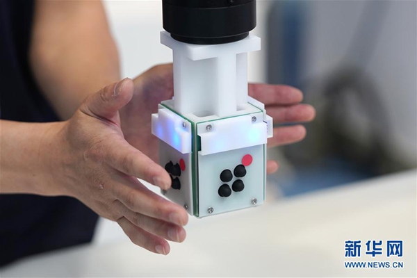 6月13日,參展商在演示一款人工智能機(jī)器人觸摸傳感單元的感知效果。 新華社記者 鞠煥宗 攝