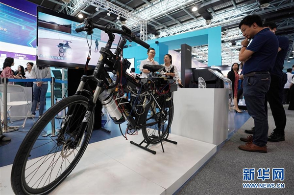 6月13日,參觀者在參觀一款搭載了類腦芯片及系統(tǒng)的自行車。通過該類腦芯片和系統(tǒng),這輛自行車可以實(shí)現(xiàn)自主跟蹤、行進(jìn)和避障等功能。 新華社記者 鞠煥宗 攝