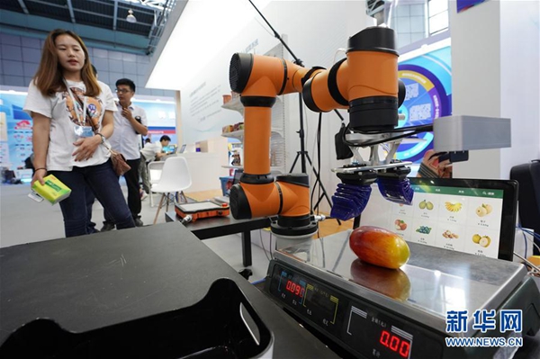 6月13日,參展商在使用一款A(yù)I智能機(jī)械人結(jié)算系統(tǒng)進(jìn)行物品稱重和結(jié)算演示。 新華社記者 鞠煥宗 攝