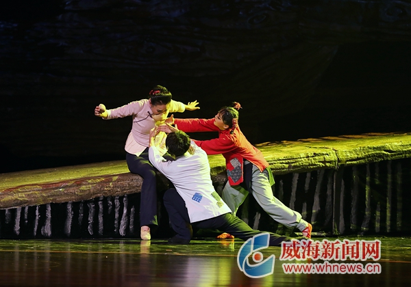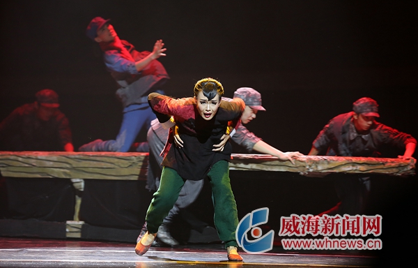 臺上,舞劇已進入了最后一幕:戰爭勝利的消息傳到了威海,群眾扭起了慶祝勝利的秧歌,乳兒的生母也回來尋找親生骨肉。