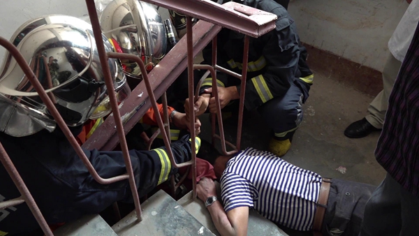 當日下午,市消防119指揮中心接到報警,一男子的頭部卡在樓梯間的欄桿里,急需救援,遂調度青島路中隊前往營救。當消防員趕到現場時,只見該男子臉朝下趴在樓梯平臺上,頭部卡在一側欄桿里。勘查現場后,現場指揮員決定使用鋼筋速斷器,小心翼翼地將欄桿剪斷,使該男子脫險。