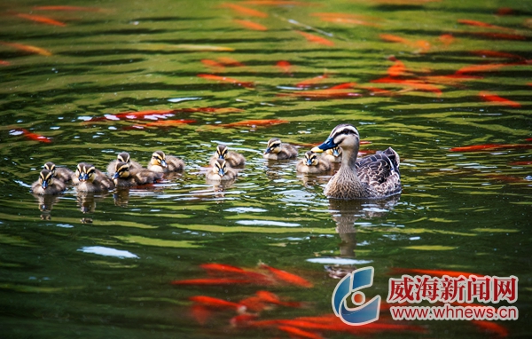 6月27日,在環翠區里口山,野生斑嘴鴨媽媽帶著孩子們在水中悠閑地游弋。斑嘴鴨屬于遷徙鳥類,繁殖期為每年的5至7月份。