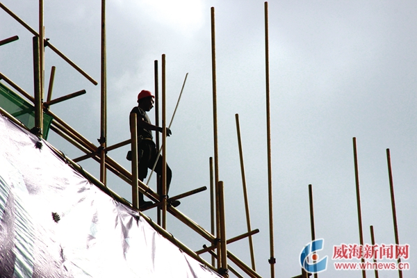 ????烈日當空,從下仰頭望最頂層,一個架子工的身影闖入眼簾。精瘦的身形站在樓房外圍的架子上,從建筑這端走向那端,像站在漁船鏢臺上與旗魚競速的鏢手。