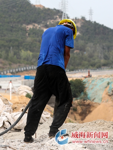 環山路附屬設施施工現場,工人們在高溫下作業,汗流浹背。 記者 孫大偉 攝