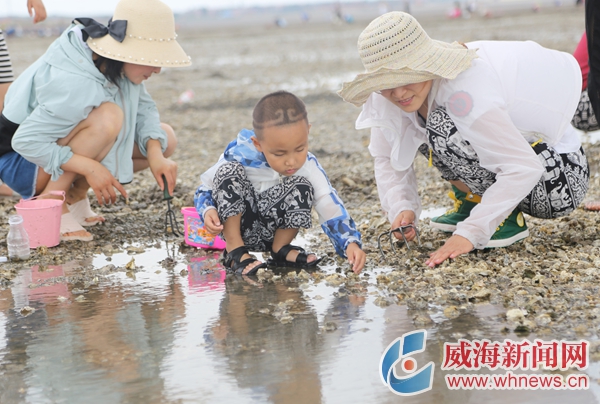 淺海灘涂上,隨處可見(jiàn)彎腰挖蛤的趕海人。水桶、漁網(wǎng)簍、耙子……大家個(gè)個(gè)裝備齊全。家住文登城區(qū)的李淑芹一早便趕到現(xiàn)場(chǎng),這次,她還邀請(qǐng)了數(shù)十位來(lái)自濟(jì)南的朋友。“一直很期待有這樣的娛樂(lè)活動(dòng),我們親近大海、體驗(yàn)收獲樂(lè)趣,也能感受到豐富的漁家文化。”李淑芹說(shuō)。
