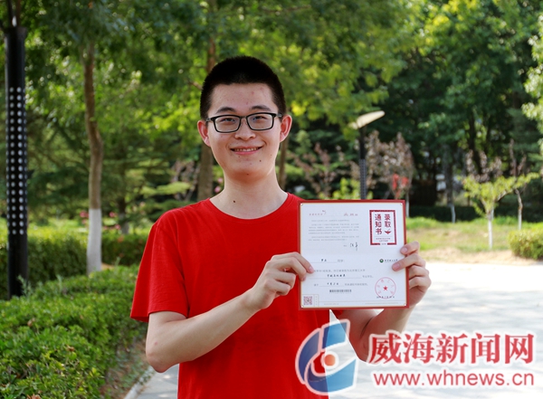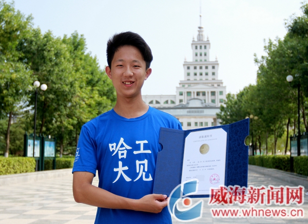 ????在一眾錄取通知書中,深藍色雙向對開的哈爾濱工業大學本部錄取通知書,以其超高顏值,格外搶眼。舉著錄取通知書,考生張賀在哈工大(威海)校園內拍照留念。