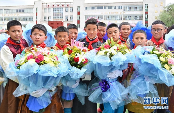 西藏拉薩市第一小學(xué)藏族學(xué)生參加畢業(yè)典禮(5月31日攝)。 新華社記者 普布扎西 攝